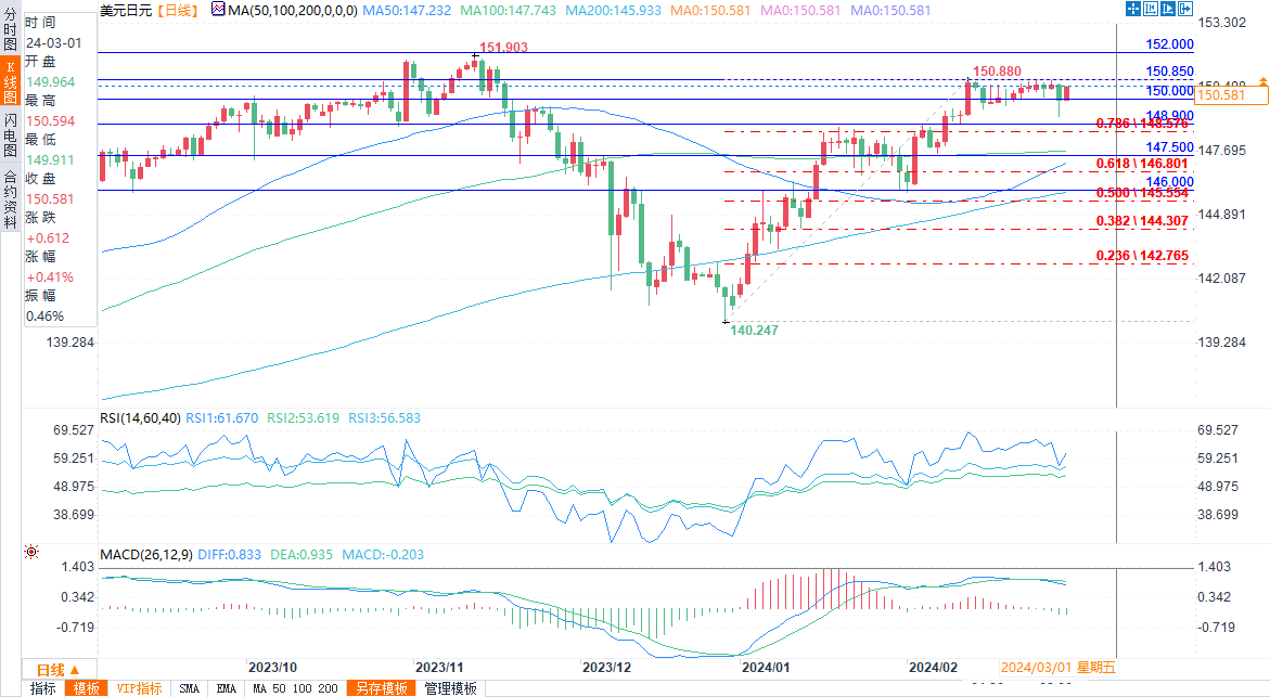 汇通财经APP讯——周五(3月1日)日元走弱。截至北京时间16:00,美元/日元报150.491/503,涨幅0.35%,欧元/日元报162.708/731,涨幅0.41%,英镑/日元报190.067...