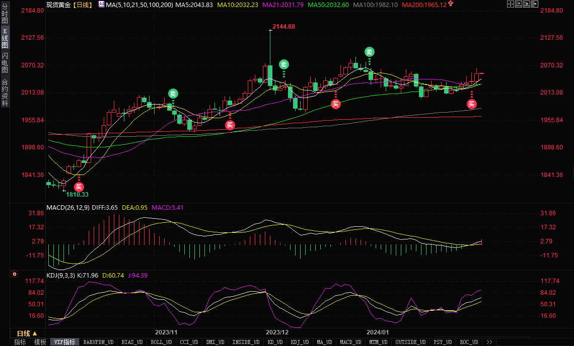 汇通财经APP讯——周四(2月1日),金价触及近一个月最高2065.19美元,收盘阶段上涨0.9%至每盎司2,054.89美元。周四数据显示美国上周初请失业金人数上升,刺激黄金尝试冲高。图片来源:易汇...