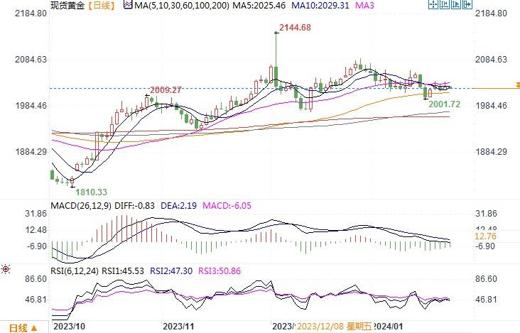 汇通财经APP讯——周二(1月23日),金价小幅上涨,0.2%,报每盎司2,025.09美元,黄金整体上仍维持着窄幅震荡的走势。投资者正紧张等待本周一系列美国经济数据公布,以获取有关美联储降息时间表的...