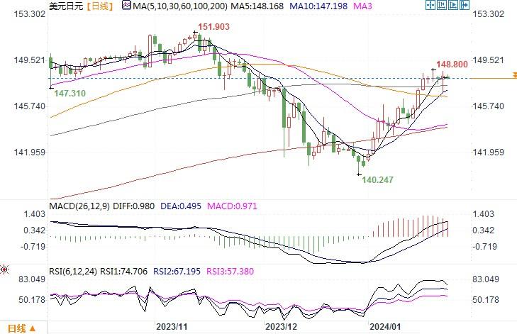 汇通财经APP讯——货币:美元/日元周二(1月23日),美元兑一篮子货币周二攀升至六周最高,因美国经济仍然稳定,市场仍预计美联储不会急于降息,投资者在短暂喘息后重启美元买盘。美元兑日元上涨,纽约盘尾上...