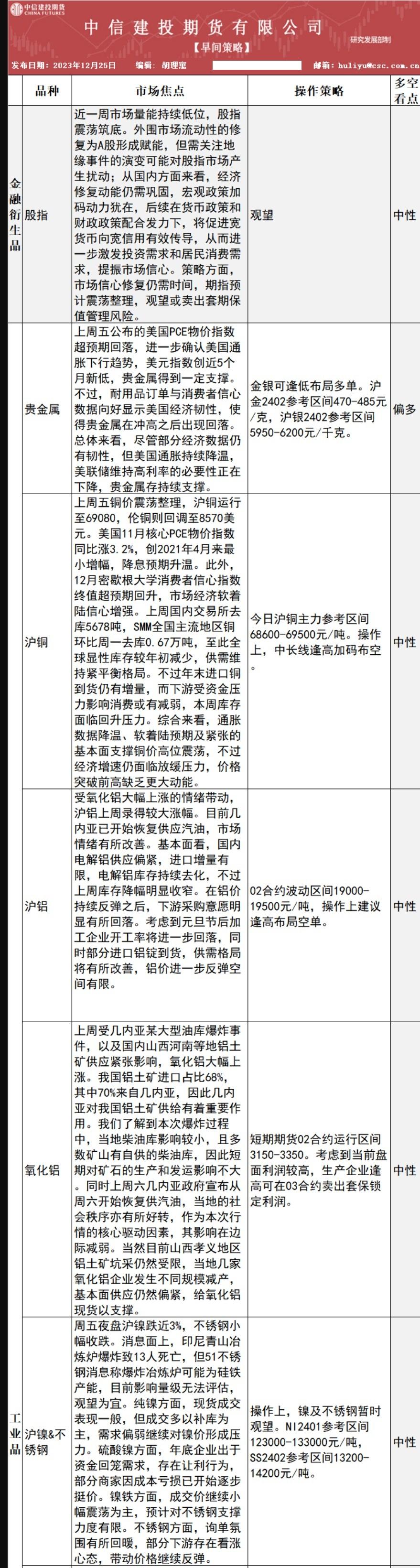 汇通财经APP讯——以下为中信建投期货12月25日对股指、贵金属、能源化工、黑色建材、有色金属、农产品期货交易提醒和建议。中信建投期货公司授权由“专注国内期货衍生品交易的专业行情分析资讯网站”:【汇通...