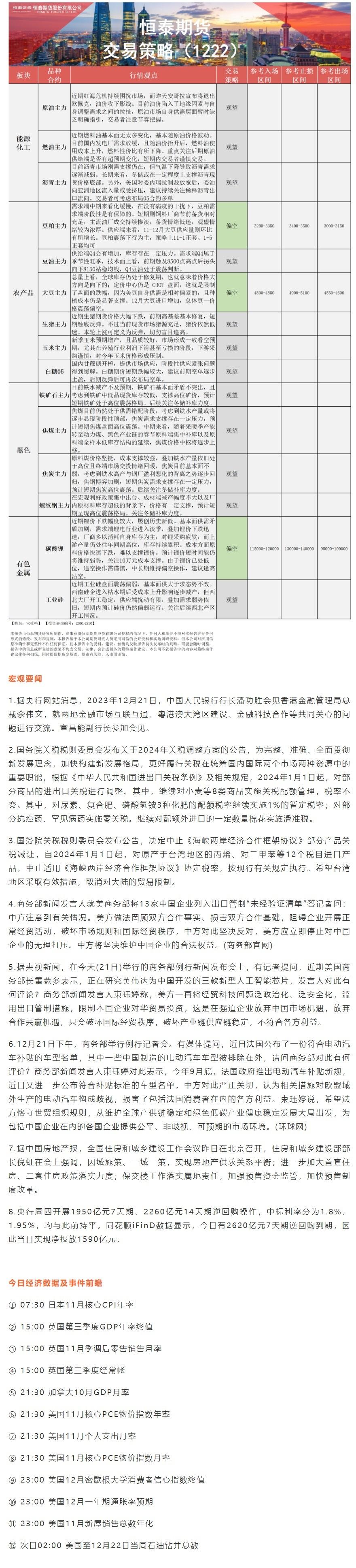 汇通财经APP讯——以下为恒泰期货12月22日对能源板块、黑色板块、农产品板块期货交易提醒和建议。恒泰期货公司授权文本由“专注期货开户交易及专业行情分析资讯网站”:【一期货 www.1qh.cn】转发