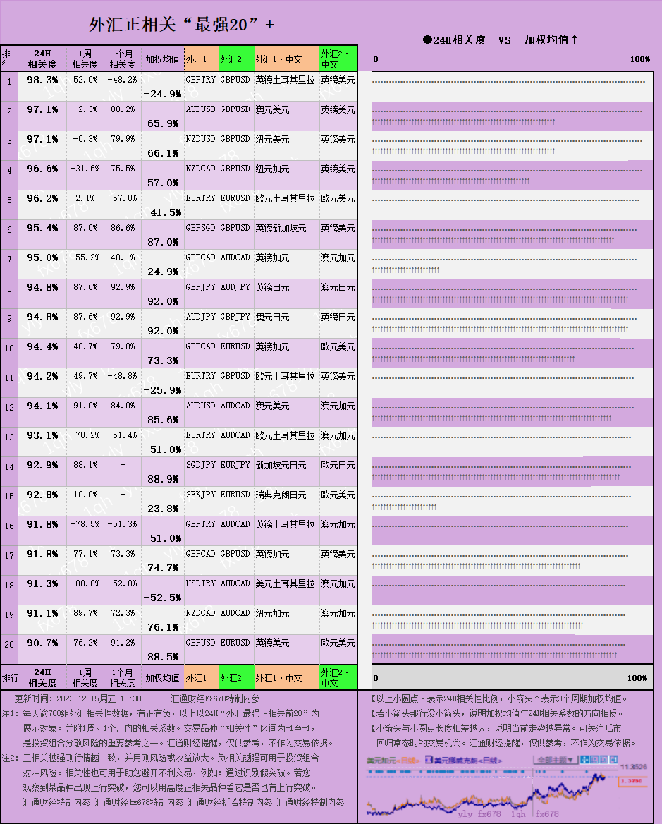 汇通财经APP讯——图解:外汇相关性+贵金属相关性一览(2023/12/15),分以下四张图分别做对比展现。每天逾700组外汇或贵金属相关性数据,有正有负,抽取24H“外汇最强相关性前20”为展示对象...