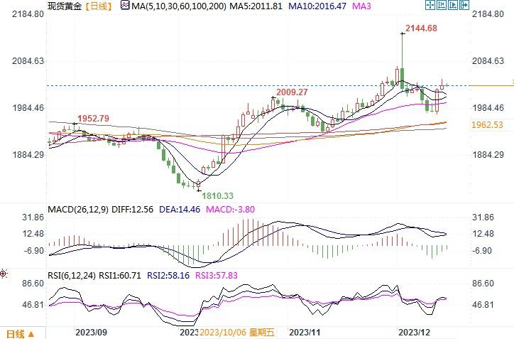 汇通财经APP讯——周四(12月14日),金价周四触及10日高位2047.49美元/盎司,收盘上涨0.5%报2,036.69美元/盎司。周四当天,美国公布的11月零售销售环比升0.3%,预期降0.1%...