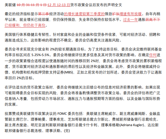 美联储12月12-13日货币政策会议声明全文及近两次声明对比