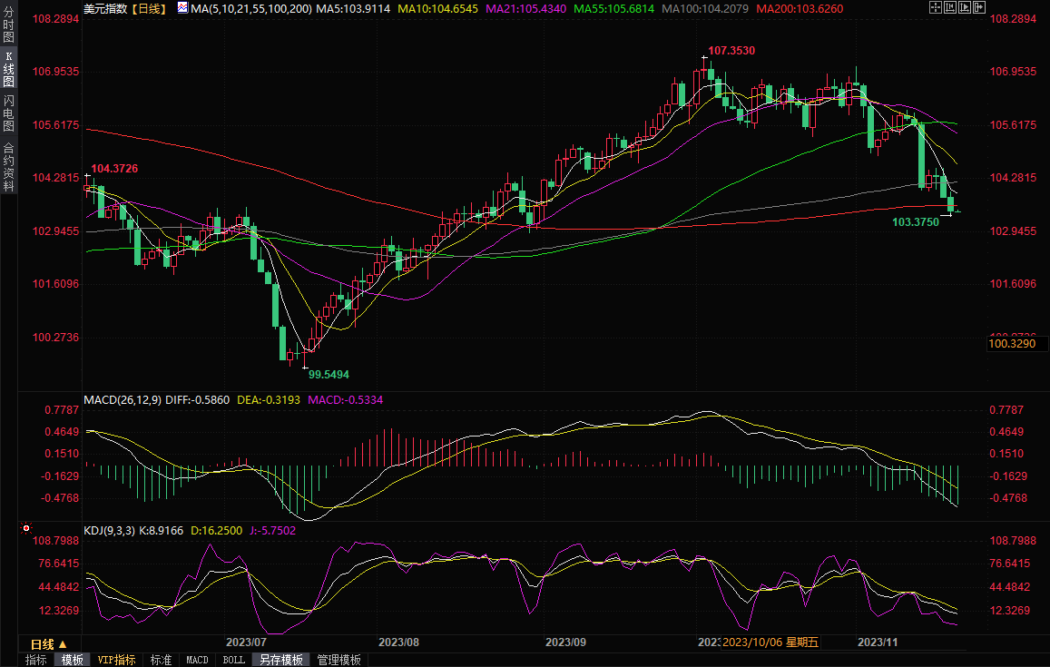 汇通财经APP讯——在上周经历了自7月以来的最大单周跌幅后,美元以维持下行轨迹拉开了新的一周的序幕。周一(11月20日),美元指数跌至过去2个月来的最低水平,最低至103.36,同时根据近期经济发展发...