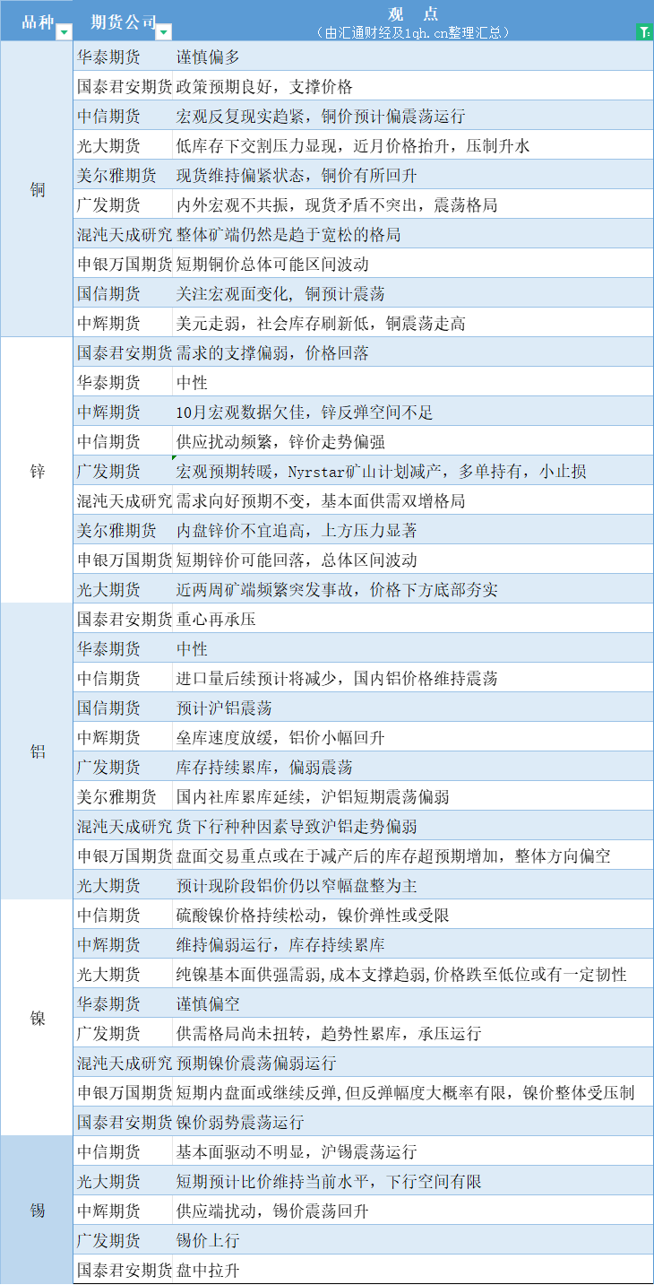 汇通财经APP讯——期货公司观点汇总一张图:11月14日有色系(铜、锌、铝、镍、锡等)