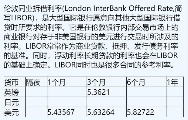 汇通财经APP讯—— 伦敦同业拆借利率(London InterBank Offered Rate,简写LIBOR),是大型国际银行愿意向其他大型国际银行借贷时所要求的利率。它是在伦敦银行内部交易市场...