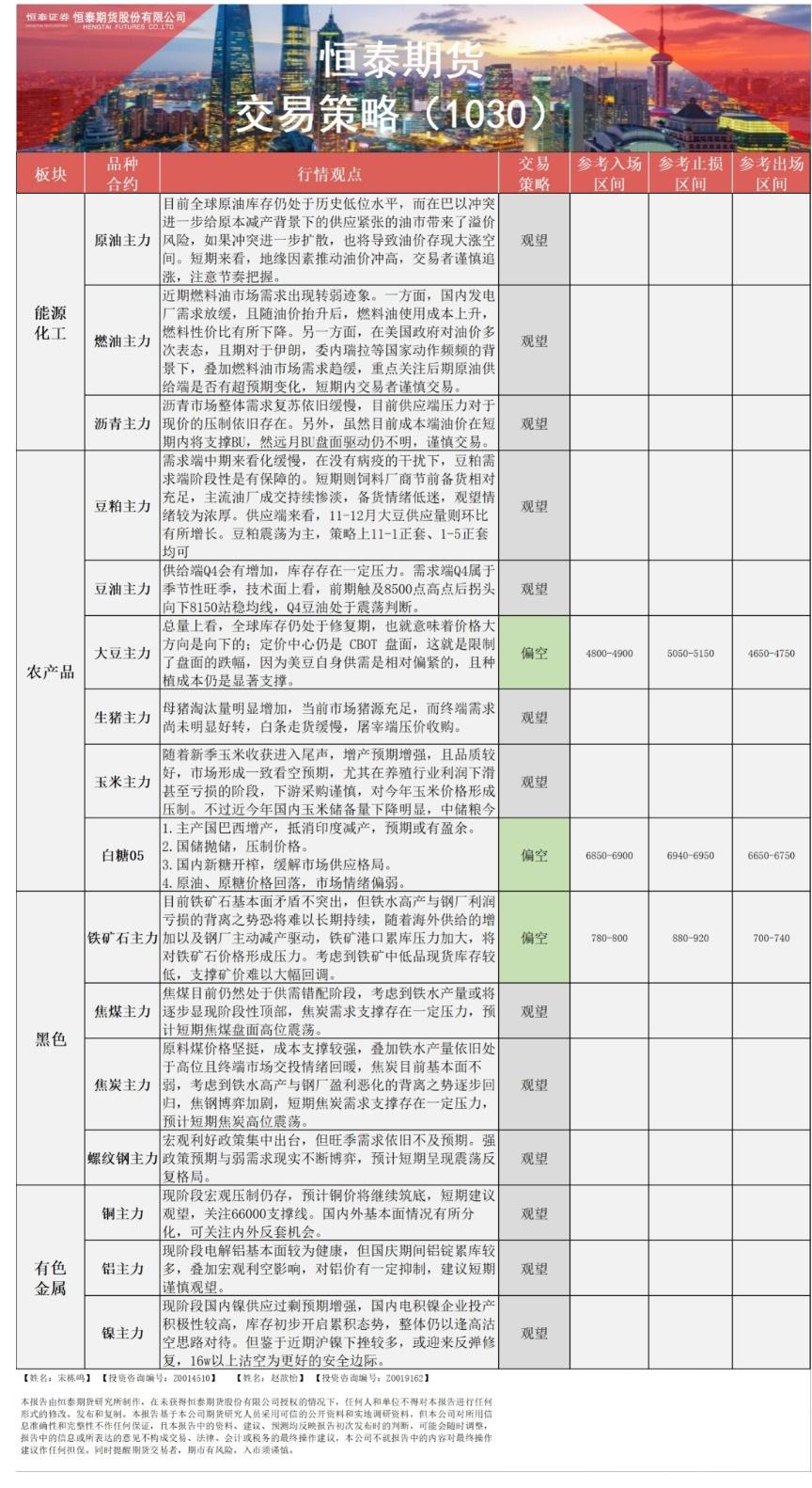 汇通财经APP讯——以下是中信期货10月30日对能源化工、黑色建材、有色金属、农产品等交易提醒和建议。中信期货公司授权文本由“专注期货开户交易及专业行情分析资讯网站”:【一期货 www.1qh.cn】...