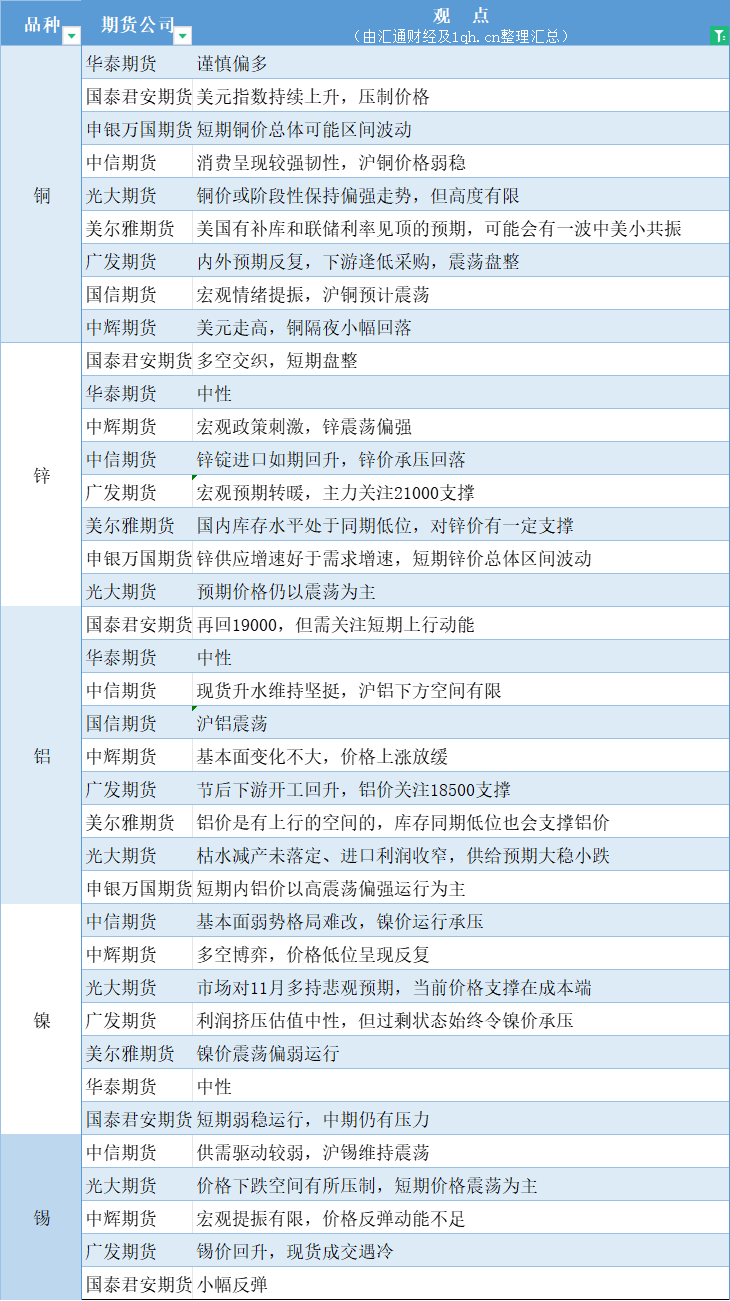 汇通财经APP讯——期货公司观点汇总一张图:10月26日有色系(铜、锌、铝、镍、锡等)
