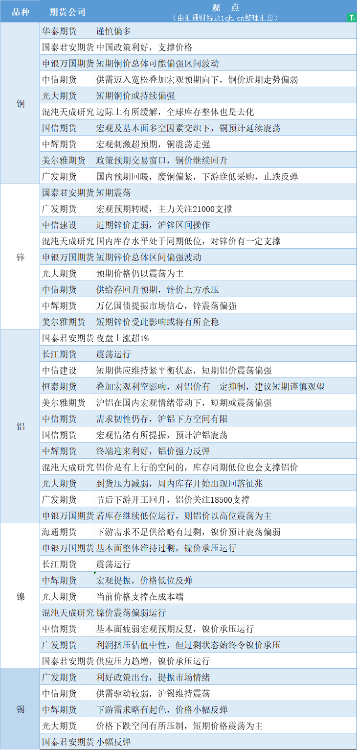 汇通财经APP讯——期货公司观点汇总一张图:10月25日有色系(铜、锌、铝、镍、锡等)