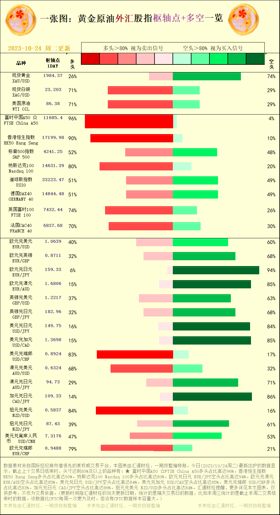 一张图:2023/10/24黄金原油外汇股指"枢纽点+多空占比"一览