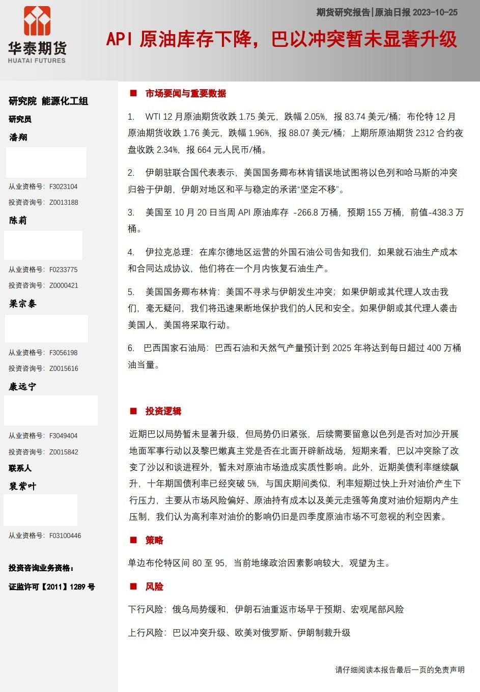 华泰期货10月25日原油日报:API 原油库存下降,巴以冲突暂未显著升级