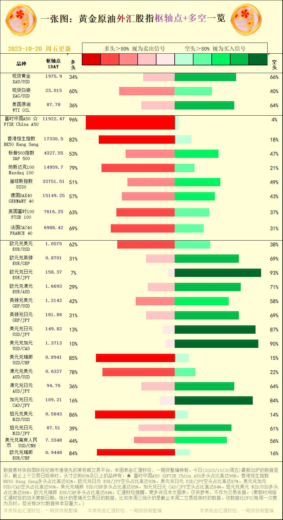 一张图:2023/10/20黄金原油外汇股指"枢纽点+多空占比"一览