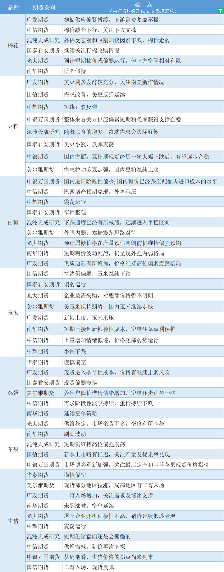 汇通财经APP讯——期货公司观点汇总一张图:10月18日农产品(棉花、豆粕、白糖、玉米、鸡蛋、生猪等)