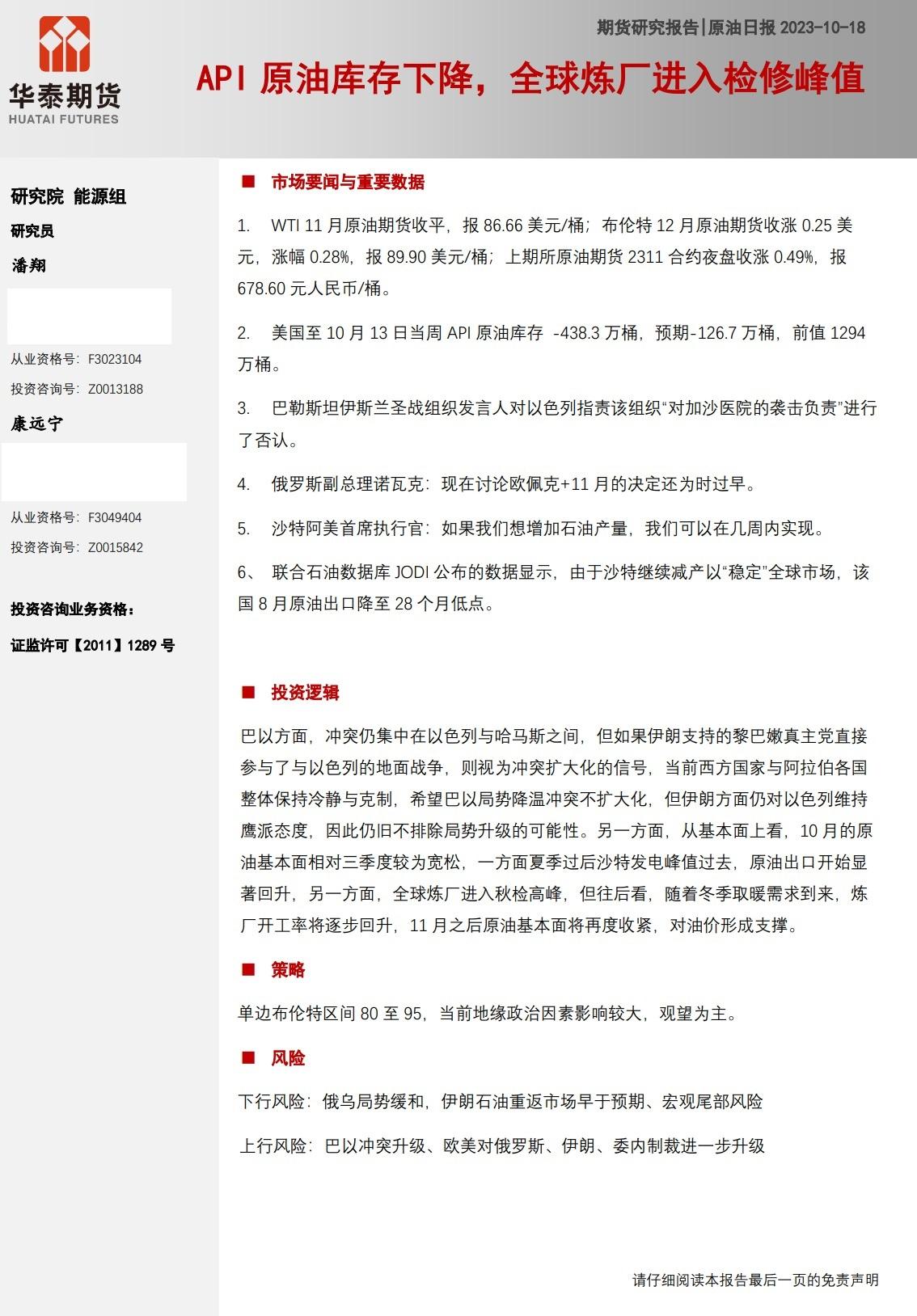 华泰期货10月18日原油日评:API原油库存下降,全球炼厂进入检修峰值