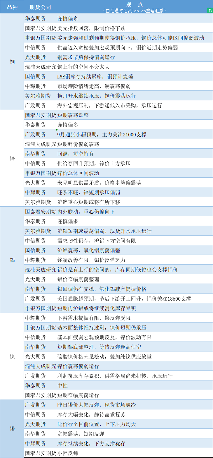 汇通财经APP讯——期货公司观点汇总一张图:10月17日有色系(铜、锌、铝、镍、锡等)