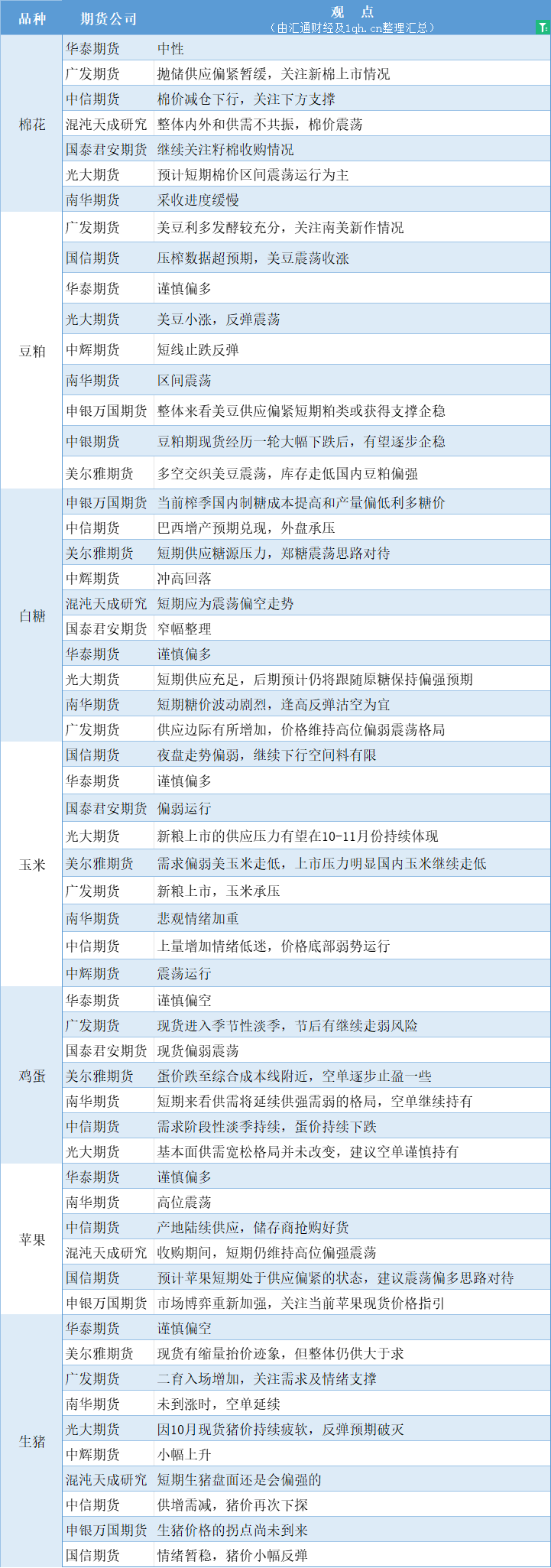 汇通财经APP讯——期货公司观点汇总一张图:10月17日农产品(棉花、豆粕、白糖、玉米、鸡蛋、生猪等)
