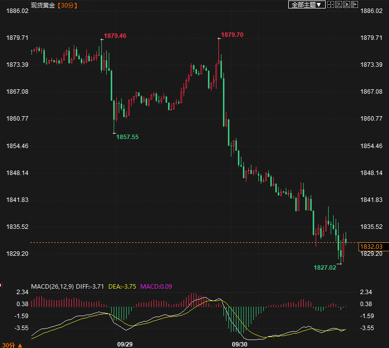 汇通财经APP讯——周一(10月2日)纽约时段,美元坚挺和美国加息前景削弱了金价的光芒,金价周一连续第六个交易日延续跌势,触及近七个月低点。截至发稿,现货黄金回落至1830美元/盎司下方,现报1828...