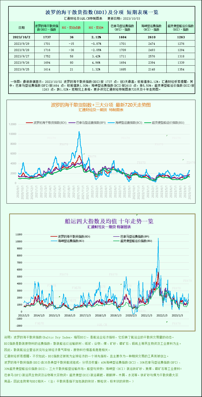 汇通财经APP讯——最新数据显示,2023年10月02日 波罗的海干散货指数(BDI)报 1737点,创3天最高,较前值涨2.12%。其中,巴拿马型运费指数(BPI)报1684点,较前值跌1.00%,...