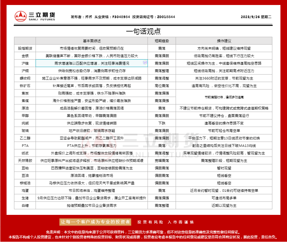 三立期货9月26日沪金、沪银、原油、有色金属等期货操作建议