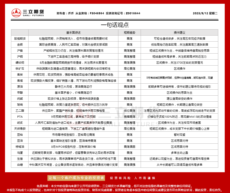 三立期货9月12日沪金、沪银、原油、有色金属等期货操作建议