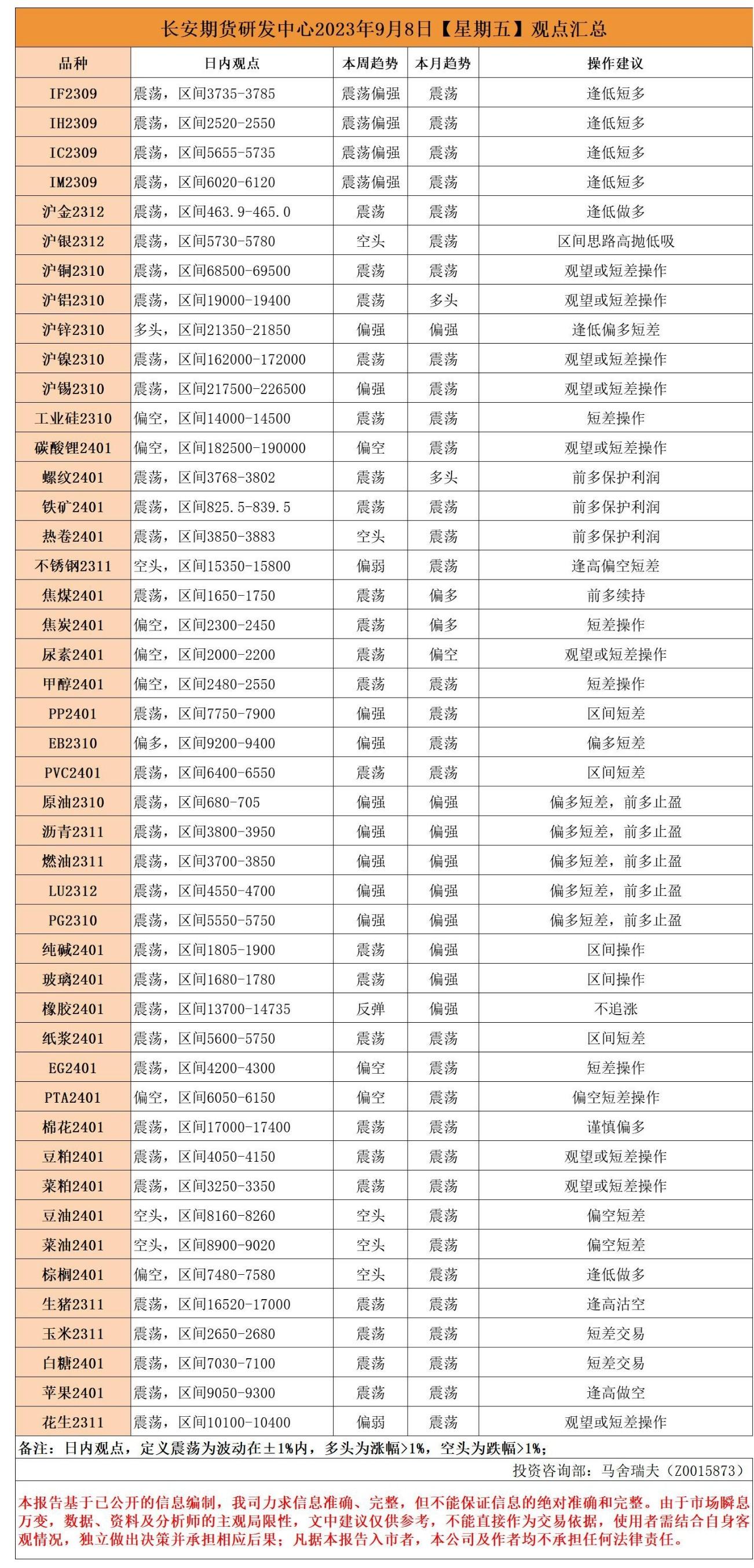 长安期货9月8日早间看盘