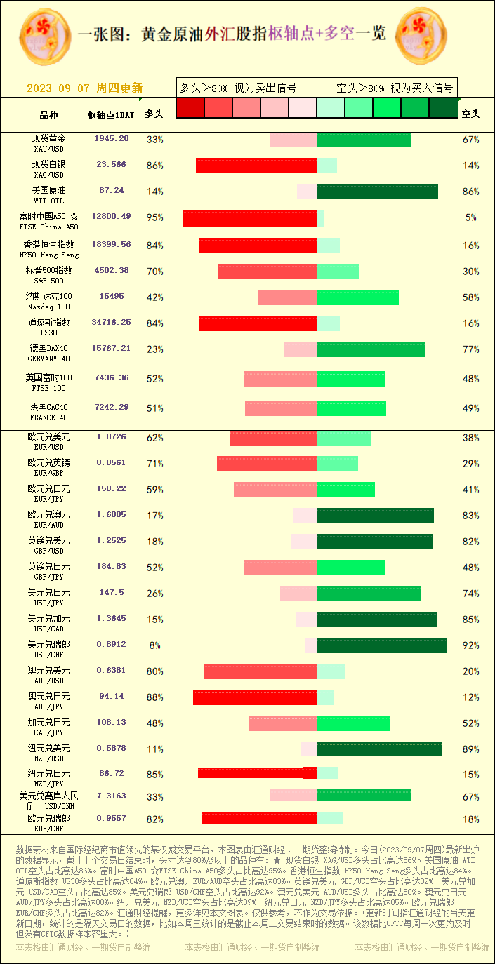 一张图:2023/09/07黄金原油外汇股指"枢纽点+多空占比"一览