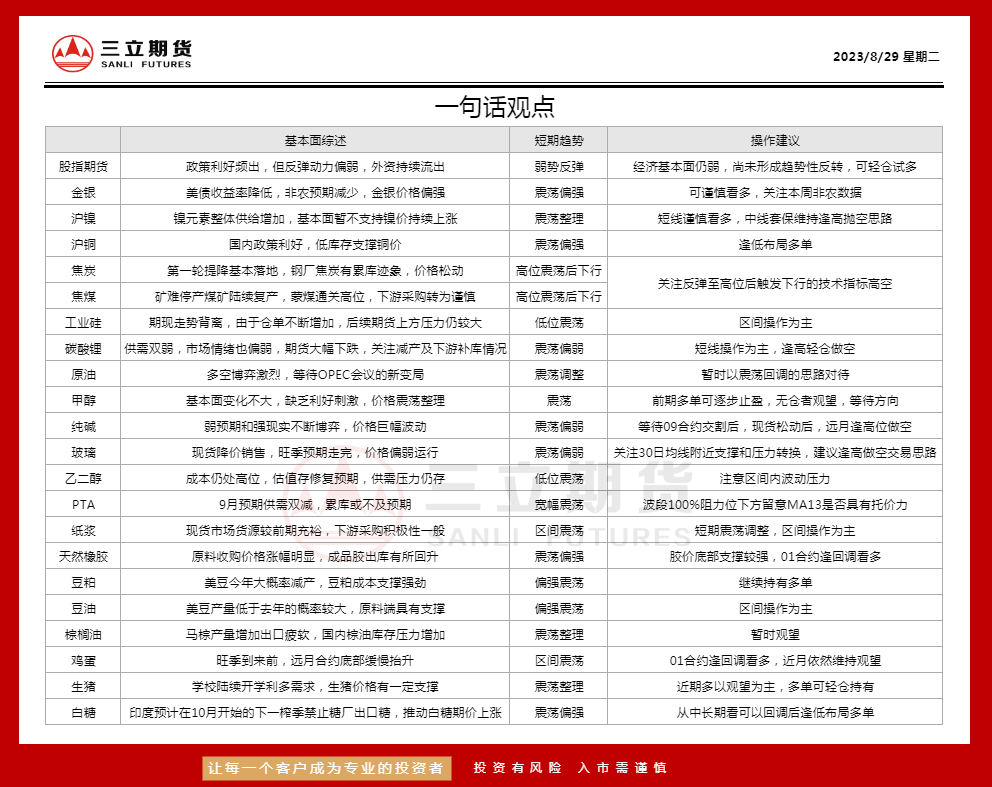 三立期货8月29日沪金、沪银、原油、有色金属等期货操作建议