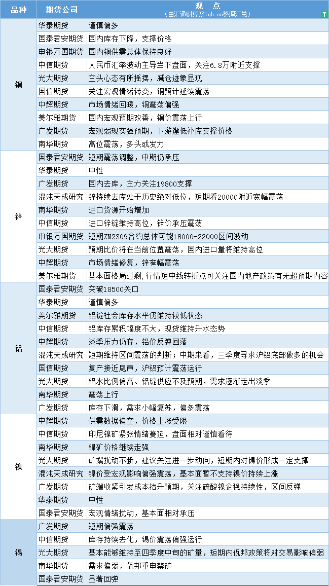汇通财经APP讯——期货公司观点汇总一张图:8月23日有色系(铜、锌、铝、镍、锡等)
