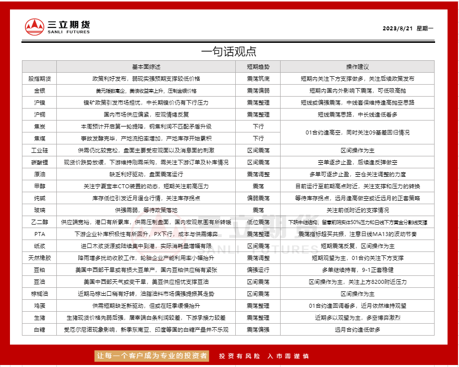 三立期货8月21日沪金、沪银、原油、有色金属等期货操作建议