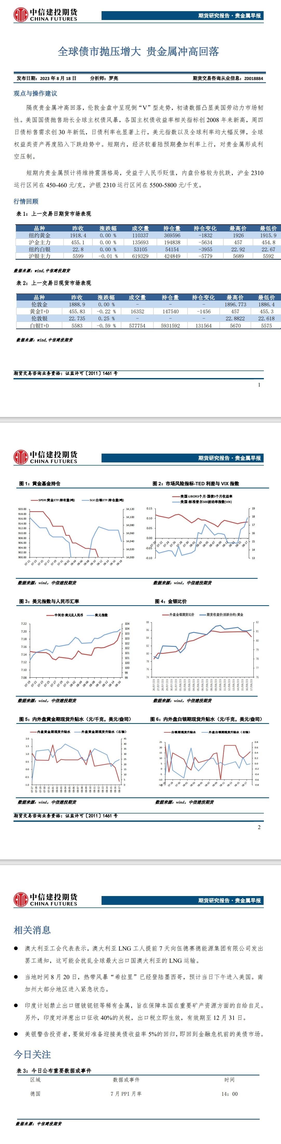 中信建投期货8月21日贵金属早报:全球债市抛压增大 贵金属冲高回落