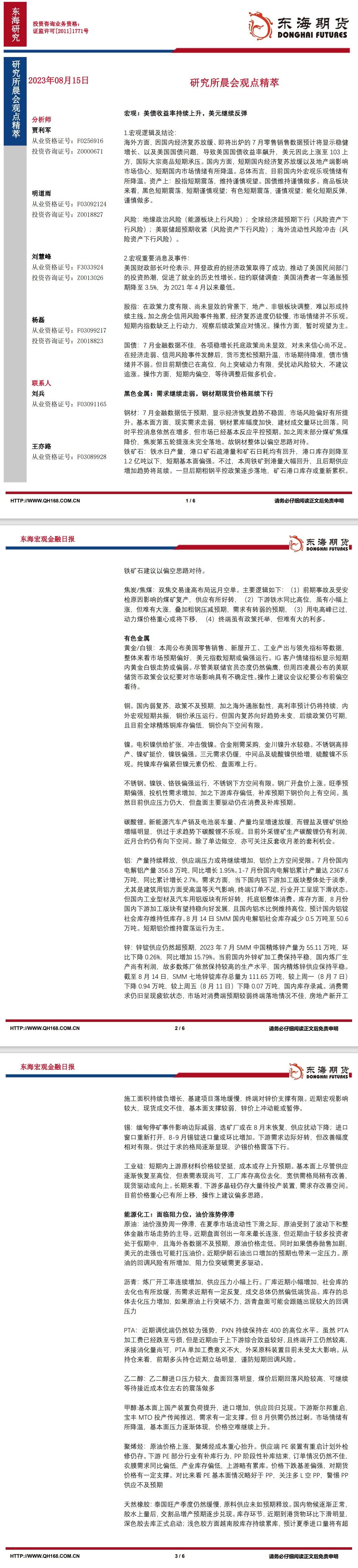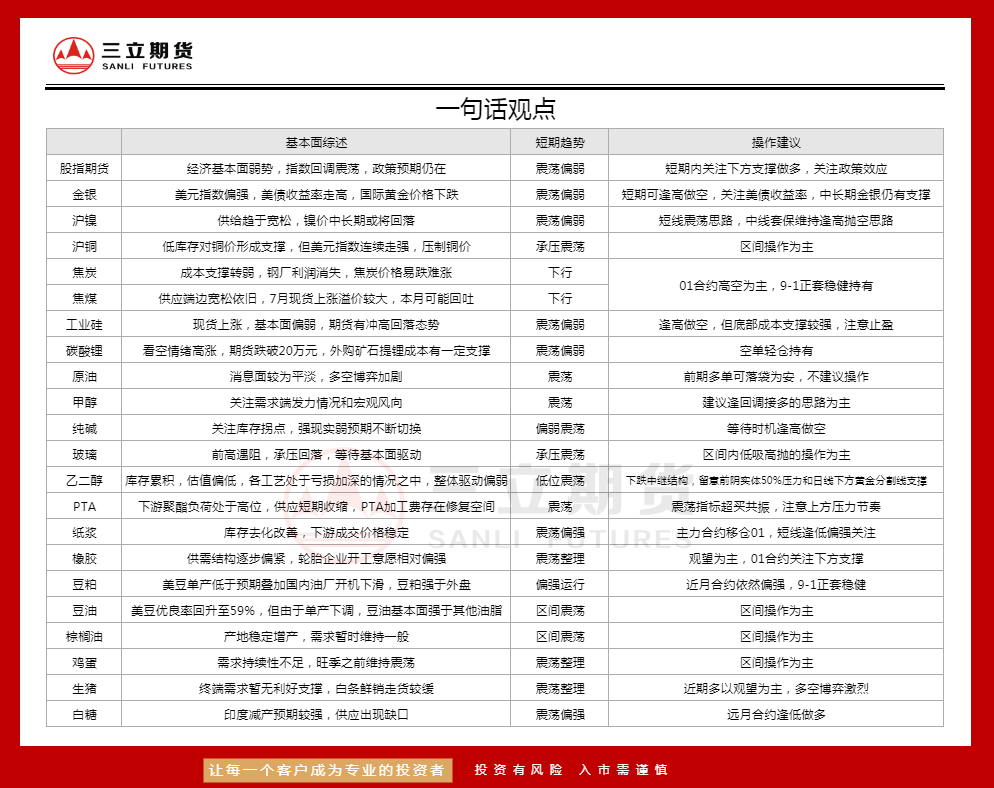 三立期货8月15日沪金、沪银、原油、有色金属等期货操作建议