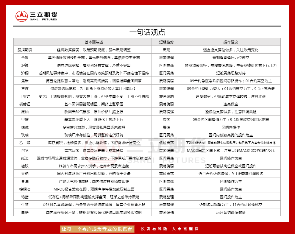 三立期货8月10日沪金、沪银、原油、有色金属等期货操作建议