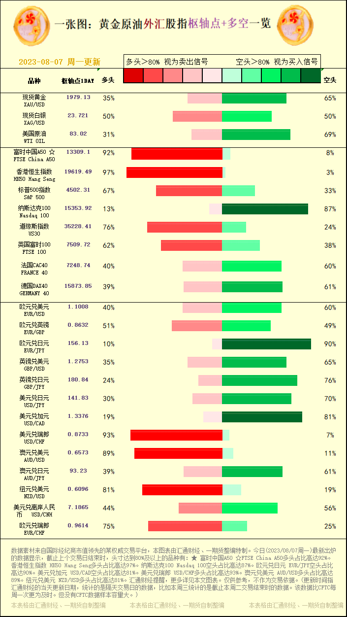 汇通财经APP讯——一张图:黄金原油外汇股指"枢纽点+多空占比"一览。今日(2023/08/07周一)最新出炉的数据显示,截止上个交易日结束时,头寸达到80%及以上的品种有:★ 富时中国A50 ☆FT...