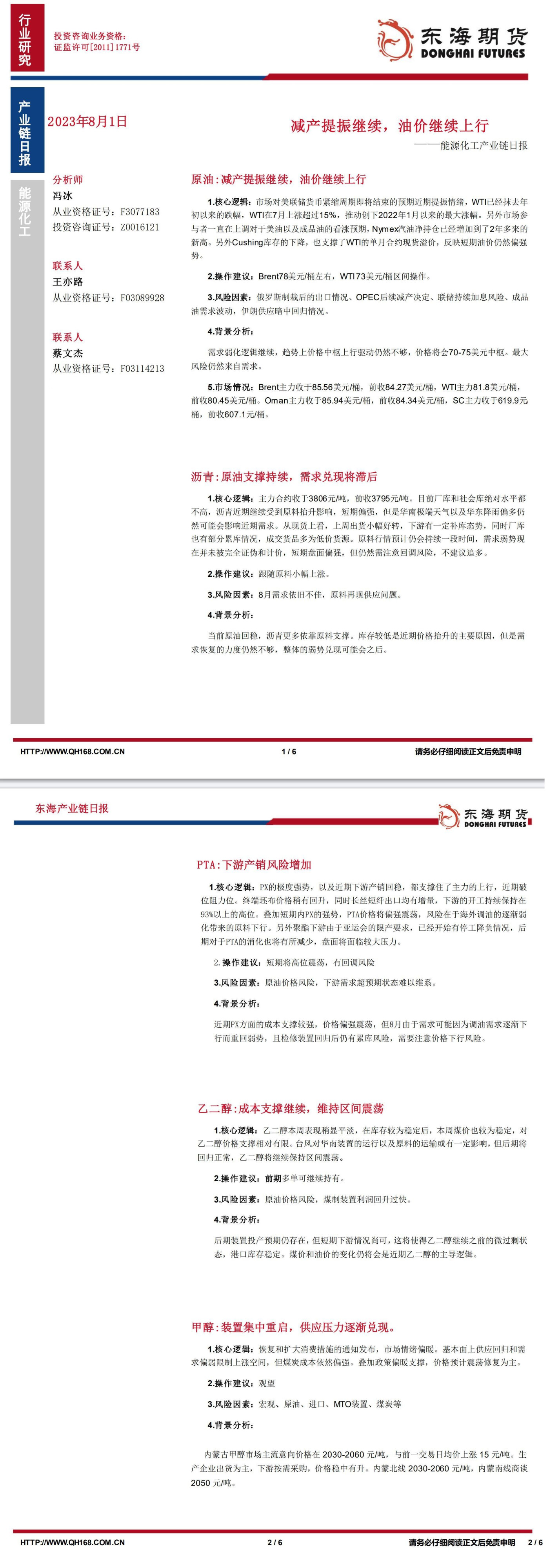 【东海期货8月1日产业链日报】能化篇:减产提振继续,油价继续上行