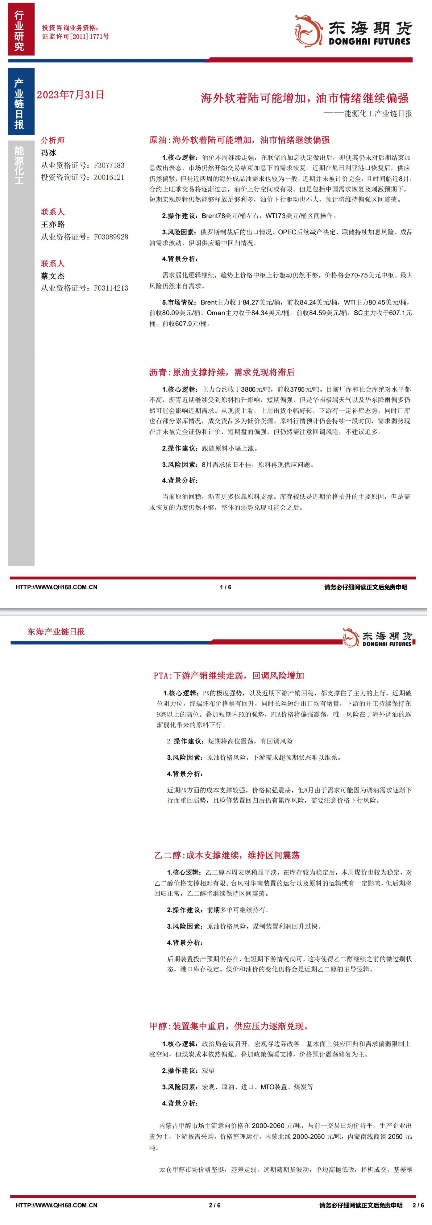 【东海期货7月31日产业链日报】能化篇:海外软着陆可能增加,油市情绪继续偏强