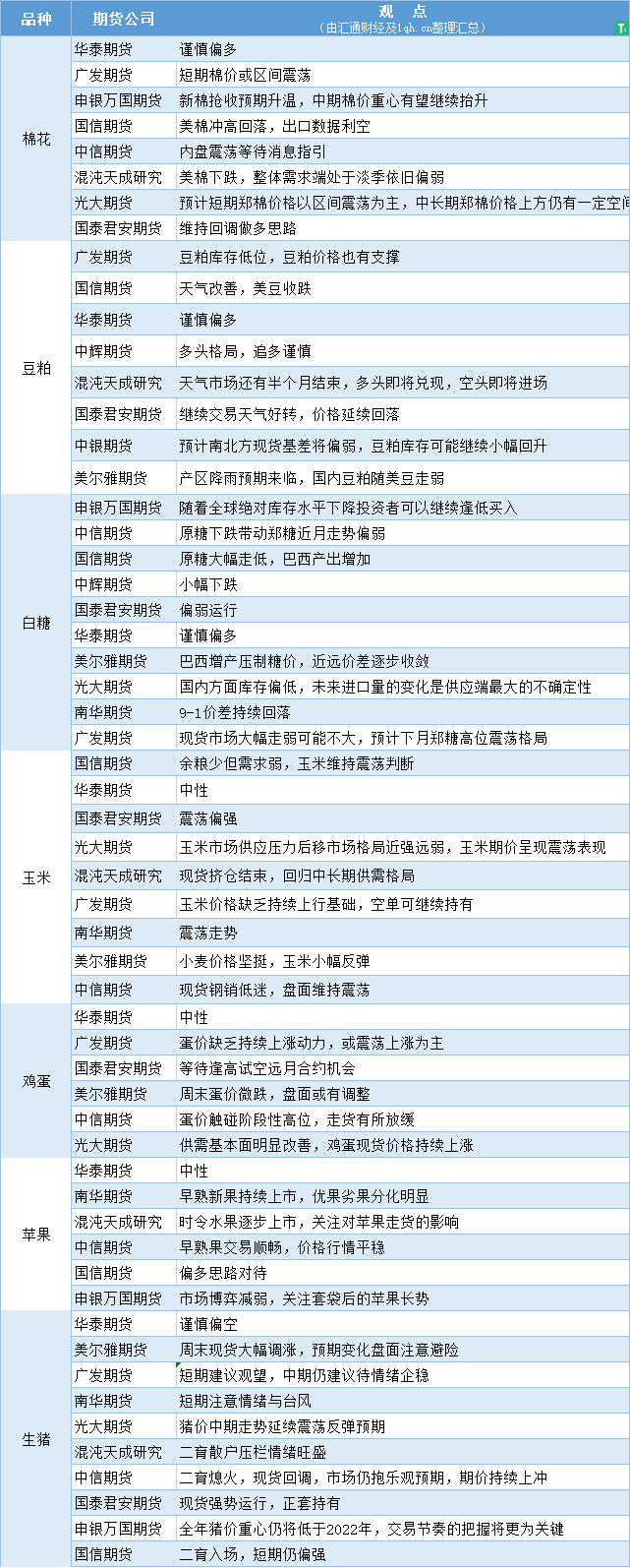 汇通财经APP讯——期货公司观点汇总一张图:7月31日农产品(棉花、豆粕、白糖、玉米、鸡蛋、生猪等)