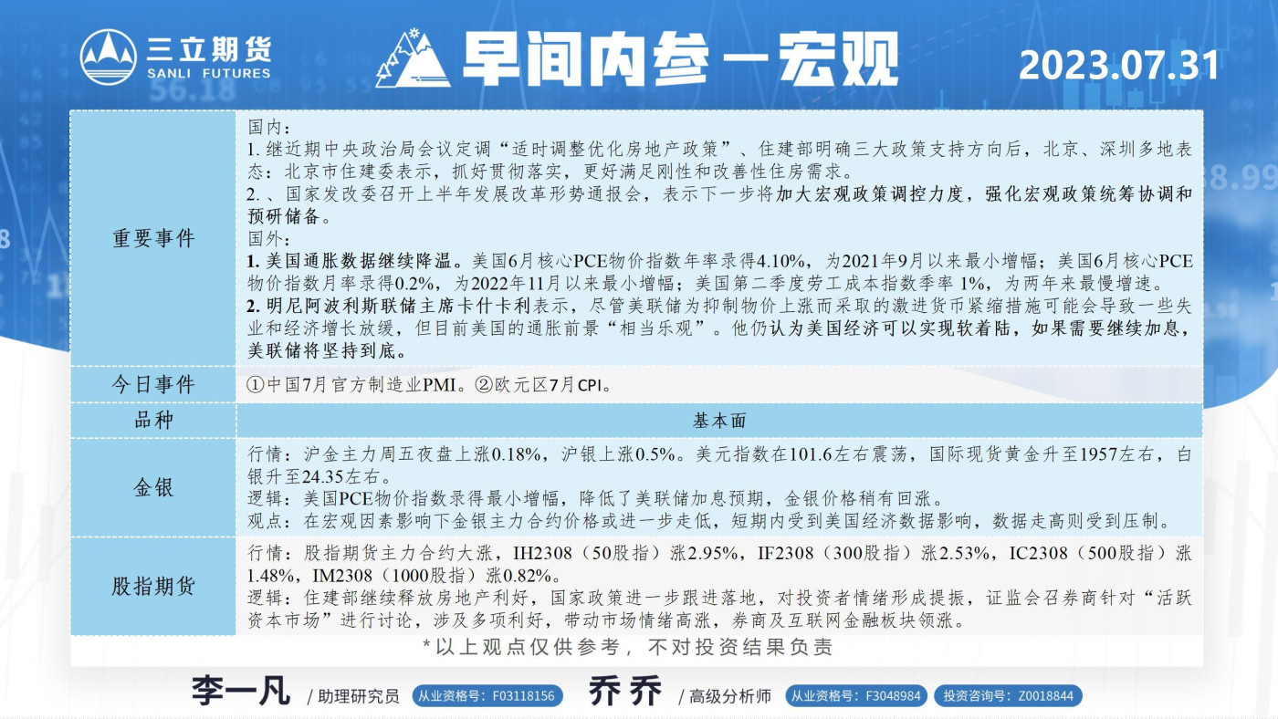 三立期货7月31日早间内参——宏观