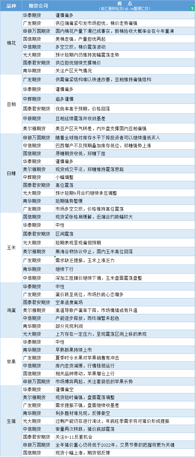 汇通财经APP讯——期货公司观点汇总一张图:7月18日农产品(棉花、豆粕、白糖、玉米、鸡蛋、生猪等)