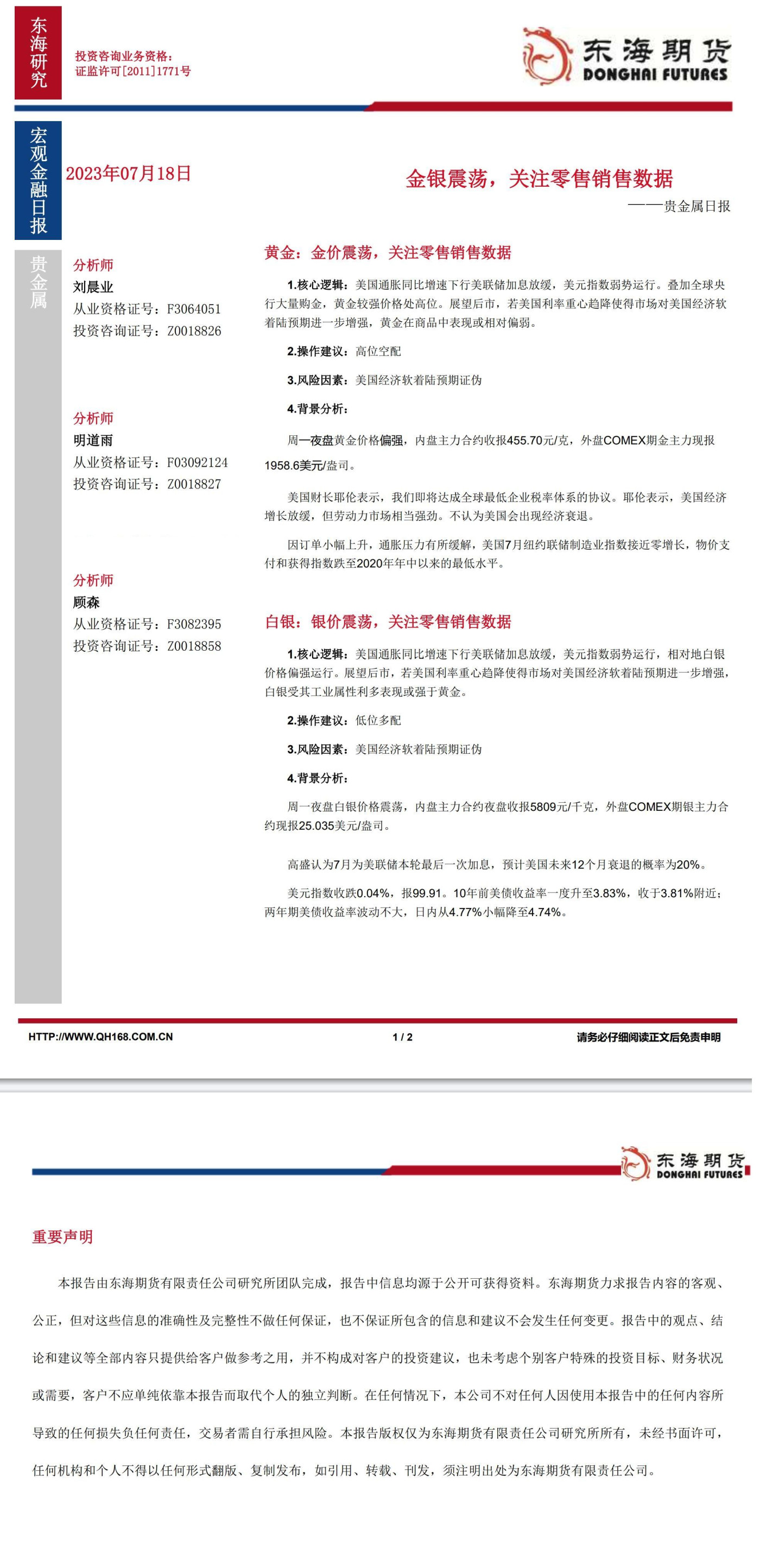 【东海期货7月18日产业链日报】贵金属篇:金银震荡,关注零售销售数据