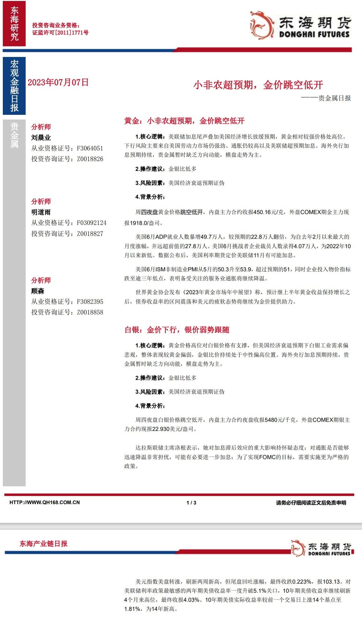 【东海期货7月7日产业链日报】贵金属篇:小非农超预期,金价跳空低开
