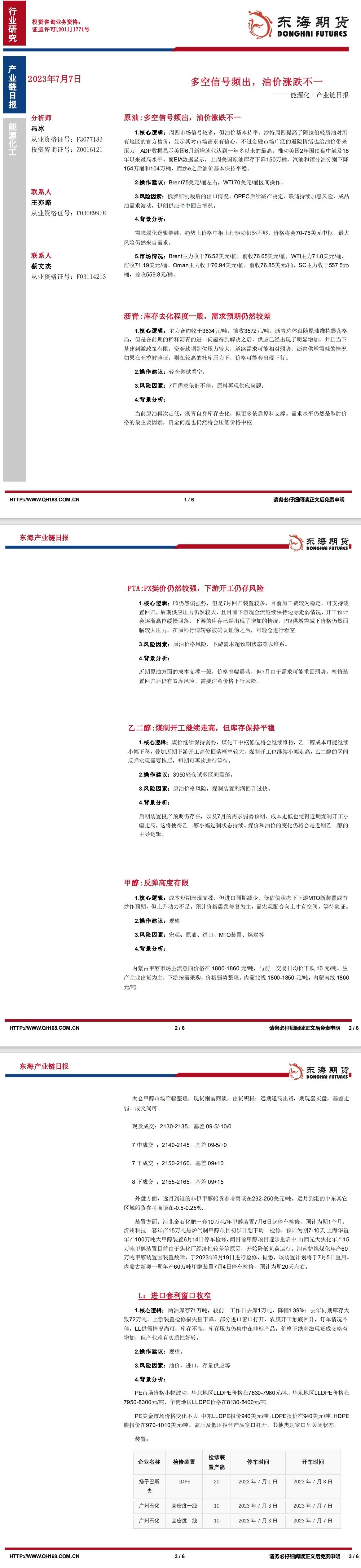【东海期货7月7日产业链日报】能化篇:多空信号频出,油价涨跌不一