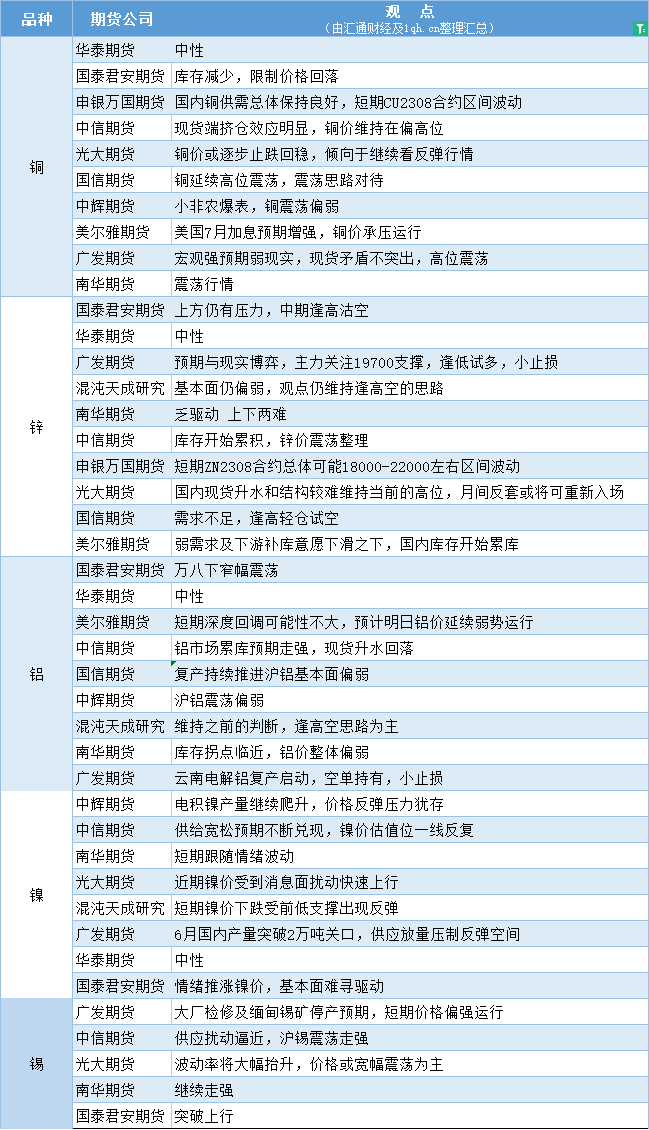 汇通财经APP讯——期货公司观点汇总一张图:7月7日有色系(铜、锌、铝、镍、锡等)