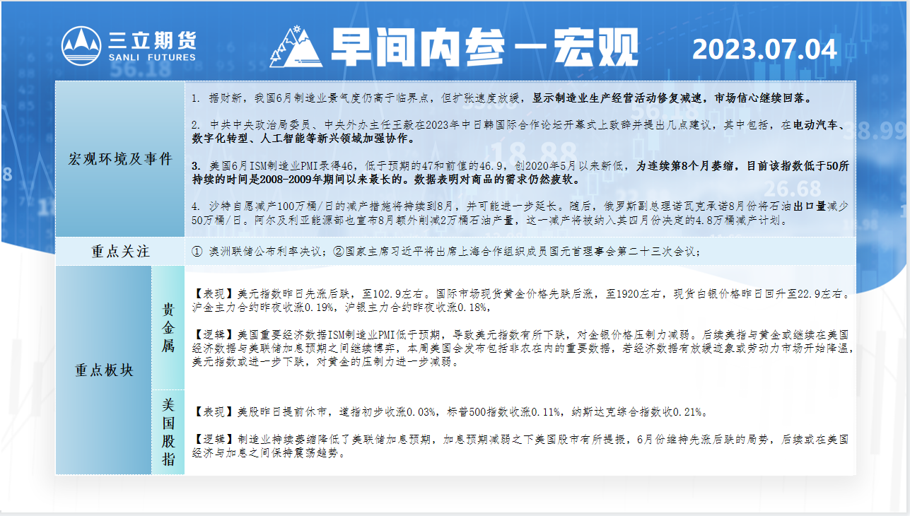 三立期货7月4日早间内参——宏观