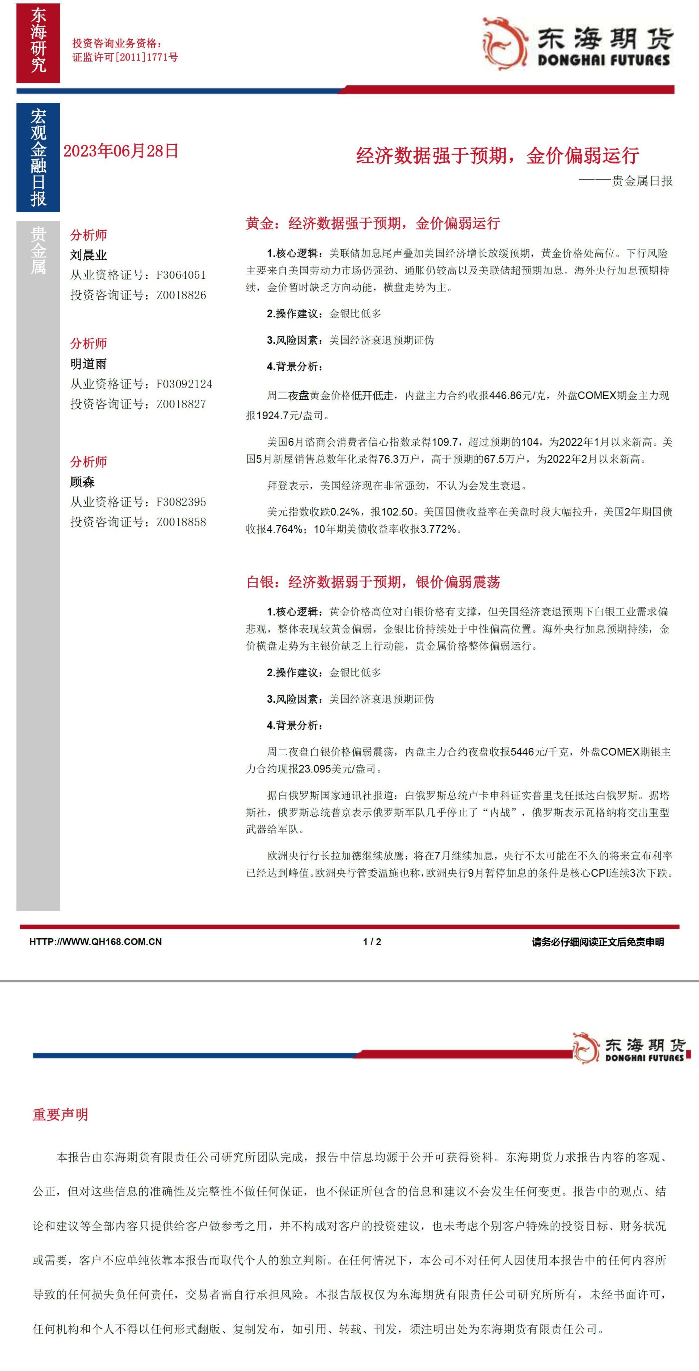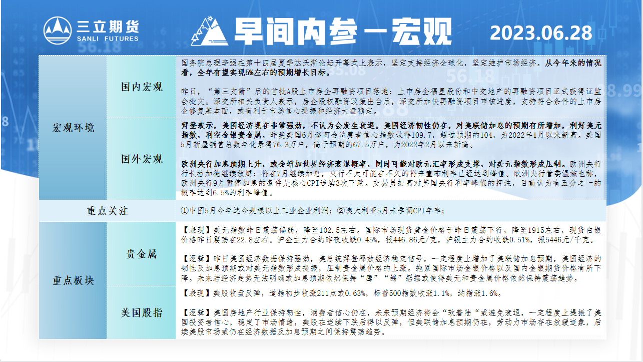 汇通财经APP讯——三立期货早间内参显示,美元指数昨日震荡偏弱,降至102.5左右。国际市场现货黄金价格于昨日震荡下行,降至1915左右,现货白银价格昨日震荡在22.8左右。沪金主力合约昨夜收跌0.4...