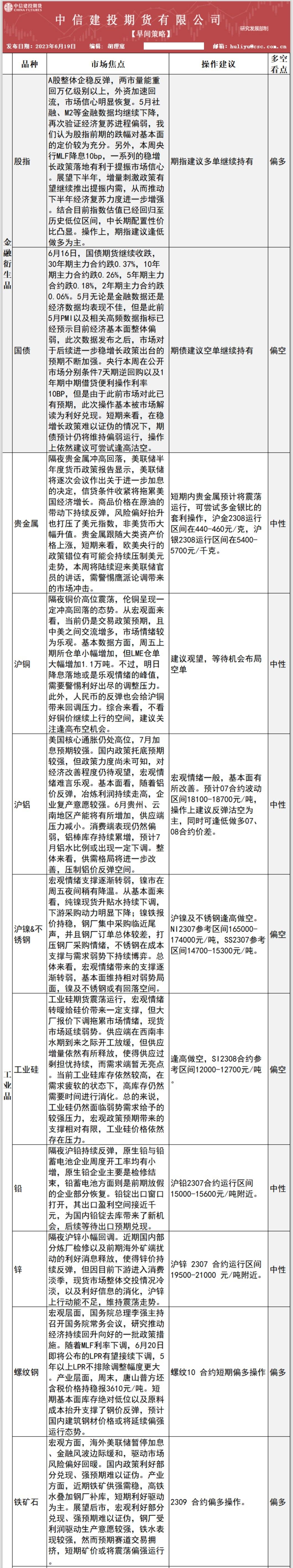 中信建投期货6月19日早间交易策略
