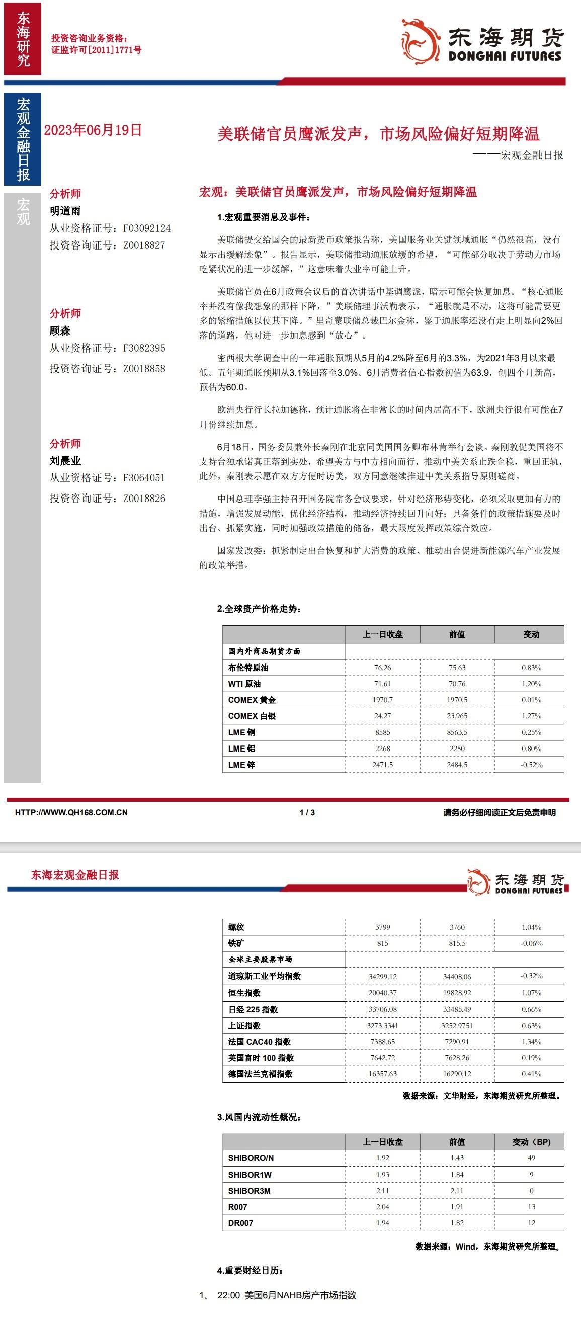 【东海期货6月19日宏观金融日报】:美联储官员鹰派发声,市场风险偏好短期降温