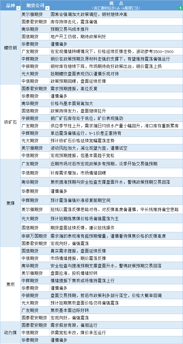 汇通财经APP讯——期货公司观点汇总一张图:6月19日黑色系(螺纹钢、焦煤、焦炭、铁矿石、动力煤等)
