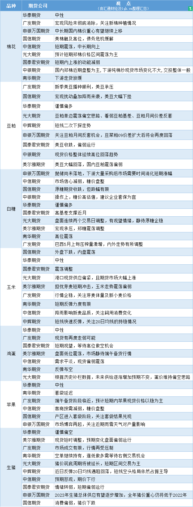 汇通财经APP讯——期货公司观点汇总一张图:5月31日农产品(棉花、豆粕、白糖、玉米、鸡蛋、生猪等)